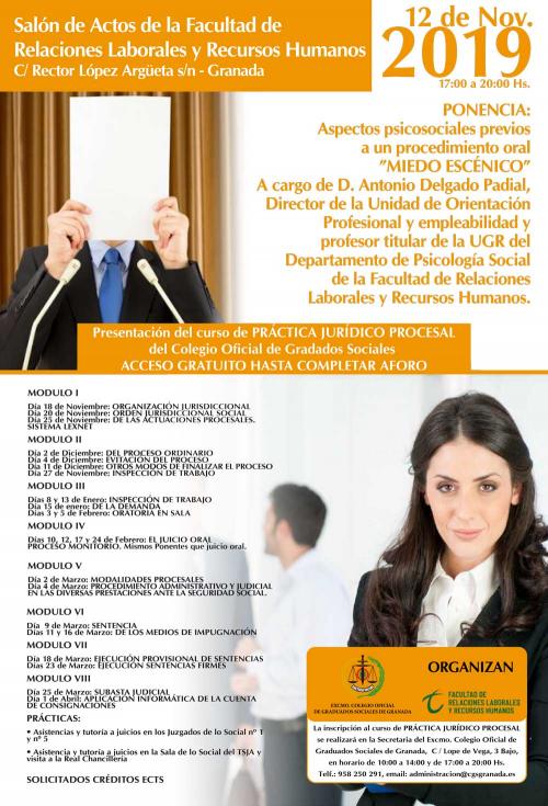 El próximo 12 de noviembre de 17:00 a 20:00 horas en el Salón de Actos de la Facultad de Relaciones Laborales y Recursos y Humanos (c/ Rector López Argueta s/n) se desarrollará una jornada bajo el título: "Aspectos psicosociales previos a un procedimiento oral - miedo escénico", que será impartida por D. Antonio Delgado Padial, Director de la Unidad de Orientación Profesional y empleabilidad y profesor titular de la UGR del Departamento de Psicología Social de la Facultad de Relaciones Laborales y Recursos Humanos.