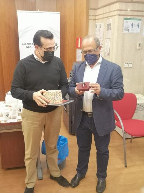 Por ello el Presidente del Colegio, D. Esteban Sánchez Montoya, acompañado de su Junta de Gobierno quiso hacerle entrega de nuestra insignia sobre una metopa, gesto que agradeció muy emocionado y con el deseo, que es también el de todos, que pronto podamos realizar este tipo de actos como veníamos haciendo.