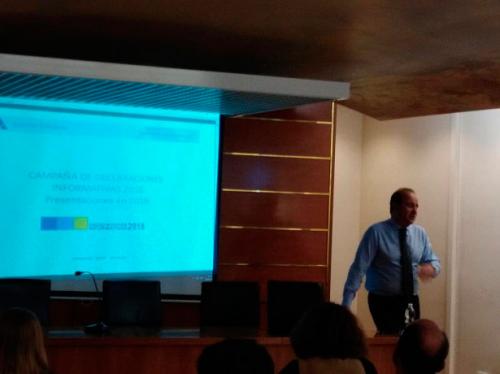 Ante un salón de actos completo de Graduados Sociales interesados en las principales novedades de la campaña informativa 2018, el ponente informó de la nueva forma de presentación de declaraciones online, la cual posibilitará la validación en línea de declaraciones de gran volumen de información, unificando el tratamiento de las declaraciones informativas.